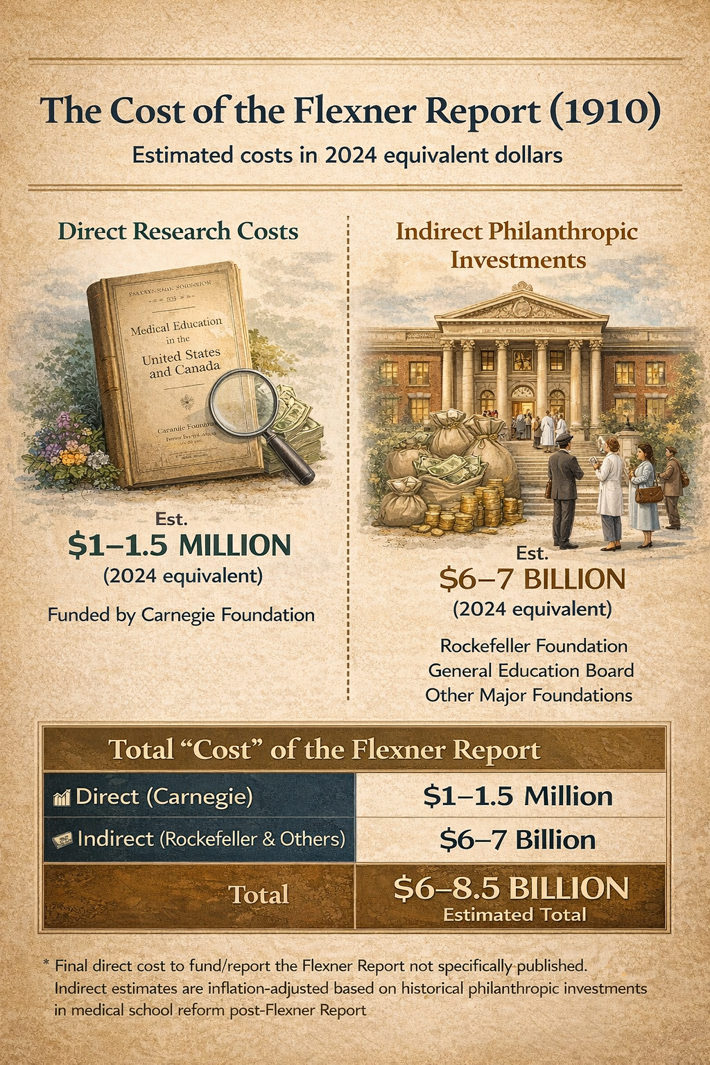 Collectively, these sources illustrate that the Flexner Report’s total “cost” encompassed not only the production of the report itself but also the massive mobilization of the juggernaut (and tax dodge) philanthropic resources that reshaped medical training and indirectly contributed to the decline of alternative and natural medical schools (still in existence today).